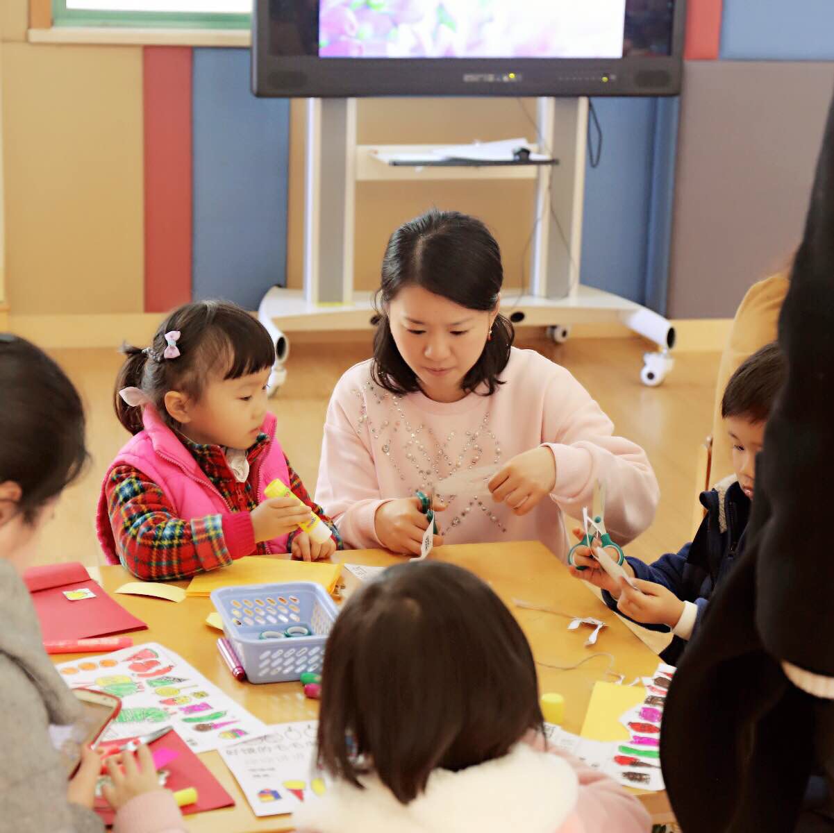 教研组带领老师观摩研讨教学活动美术活动《好饿的毛毛虫》,教师们在教研组长的带领下,围绕专题“如何在绘本故事情境下开展美术活动”展开积极交流,并重点对现场教学具的创设进行讨论。大家帮助执教老师在教具上进行调整,即要适合小班幼儿年龄特点,又要注重材料趣味性。