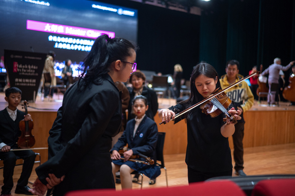 费城交响乐团与上科大合作的“保留项目”——大师班,在当天下午会议中心的主舞台上拉开序幕。上科大管弦乐团的27位成员和上科大附属学校的学生一起,在台上接受费城交响乐团演奏家的特别指导。台上台下的学生大多为理工科,没有相关的音乐专业背景,当这并不妨碍他们向往成为新时代的青年“爱乐者”。