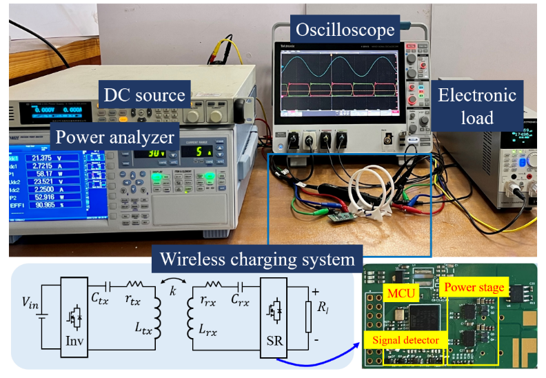 针对这一挑战,团队提出基于数字控制的高频同步整流方法,并研制60W同步整流器,峰值效率高达97.7%,比二极管方案提升超5%,系统最高温仅52.8°C。输入电压突变或负载剧烈跳变时响应平稳,输出电压无振荡,鲁棒性强。效率也远超当前的同步整流IC(其效率下在6.78MHz时仅为94%)。