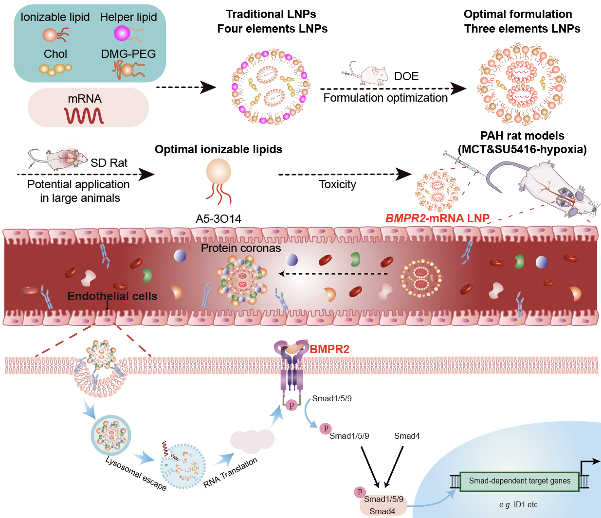 图:荷载BMPR2 mRNA的肺内皮细胞靶向LNP构建示意图及其在肺动脉高压治疗中的应用。