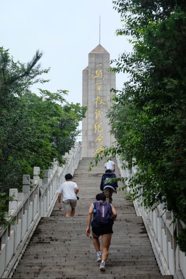 实践团队成员们沿着陡直的石阶拾级而上,走近“八路军抗战纪念碑”。