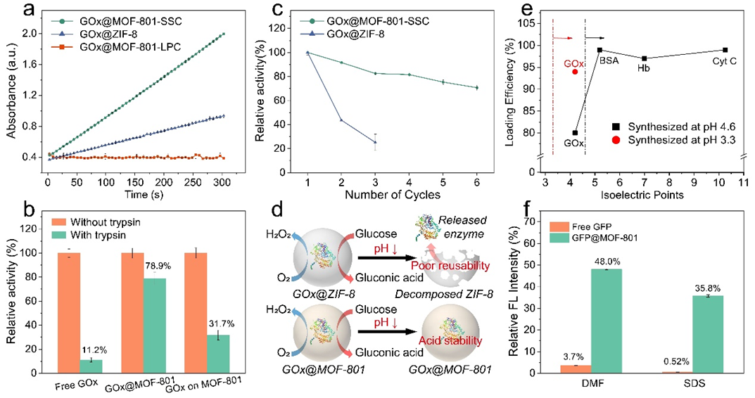 酶在工业制造领域有着广泛应用潜力,但其对极端环境(如高温、强酸或有机溶剂)非常敏感,容易在非优化条件下发生结构损伤。金属有机框架(MOFs)作为酶固定化的载体,可显著提升酶的稳定性。其中,锆基MOFs具有卓越的热、机械和化学稳定性,是酶固定化载体的优秀候选材料。传统的锆基 MOFs合成方法通常需在苛刻的溶剂热条件下进行,如高温、有机溶剂及强酸性环境,极易造成酶的不可逆失活。因此,将酶直接封装在锆基 MOFs 中极具挑战性。