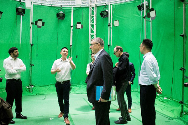 交流结束后,副教务长江舸带领Steve教授一行参观了我校创艺学院,并由信息学院的虞晶怡老师带领参观了信息学院的VR实验室,体验了360度的全景拍摄。来访人员纷纷表示对VR-3D成像的极大兴趣和及对这一科研成果的肯定。