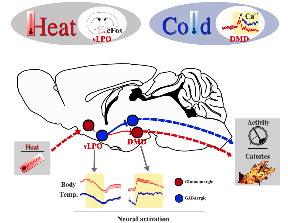 They began by defining sites in which cFos staining was induced by changes in environmental temperature. They found induced expression in subsets of neurons within the ventral part of the lateral preoptic nucleus (vLPO) and the dorsal part of the dorsomedial hypothalamus (DMD). Activation of GABAergic neurons in the vLPO using optogenetics reduced Tcore, along with a decrease in physical activity. Optogenetic inhibition of these neurons resulted in fever-level hyperthermia. These GABAergic neurons project from the vLPO to the DMD and optogenetic stimulation of the nerve terminals in the DMD also reduced body temperature and activity. Electrophysiological recording revealed that the vLPO GABAergic neurons suppressed neural activity in DMD neurons, and fiber photometry of calcium transients revealed that DMD neurons were activated by cold. Accordingly, activation of DMD neurons using DREADDs or optogenetics increased Tcore with a strong increase in calories burning and physical activity. Finally, optogenetic inhibition of DMD neurons triggered hypothermia, similar to stimulation of the GABAergic neurons in the vLPO. Thus, vLPO GABAergic neurons suppressed the thermogenic effect of DMD neurons. In aggregate, they identified novel vLPO→DMD neural pathways that reduce Tcore in response to a heat challenge, and they showed that outputs from the DMD can induce activity-induced thermogenesis.