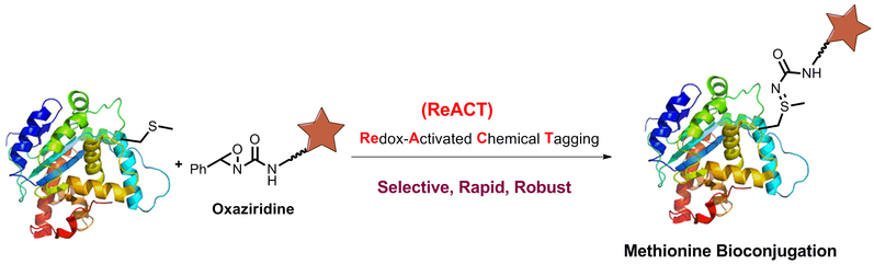 Dr. Yang and his collaborators developed a novel chemical labeling strategy, termed Redox Activated Chemical Tagging (ReACT), which for the first time enables chemoselective methionine bioconjugation in proteins and proteomes. In their work, they reported using oxaziridine-based reagents toachieve highly selective, rapid, and robust methionine labeling under a rangeof biocompatible reaction conditions. Dr. Yang and the research team alsohighlighted the broad utility of this conjugation method to enable precise additions of payloads to proteins, synthesis of antibody-drug conjugates, and identification of hyper-reactive methionine residues in whole proteomes.