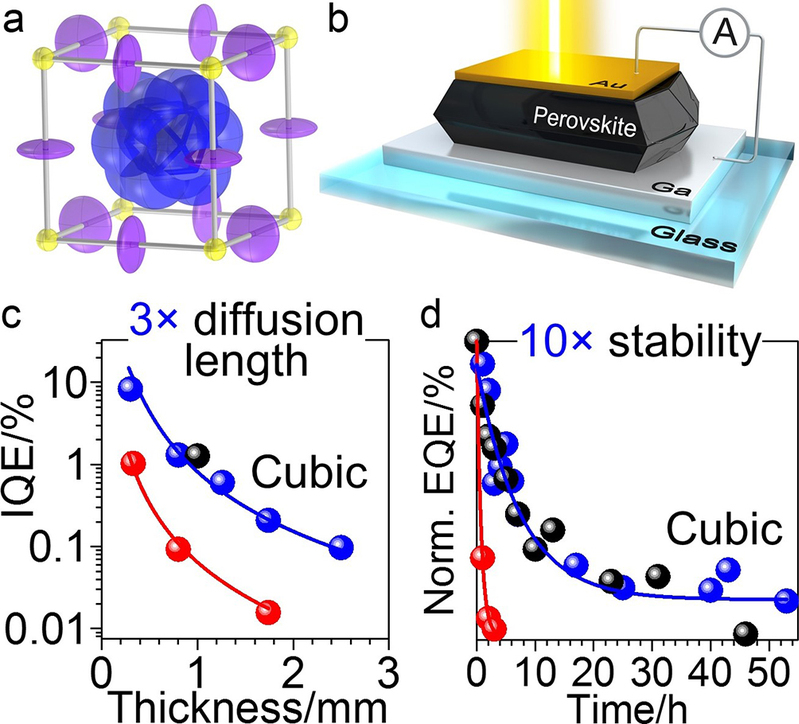 The (a) crystal structure, (b) device architecture, (c) quantum efficiency, and (d) stability data of the high-performance perovskite semiconductor materials.