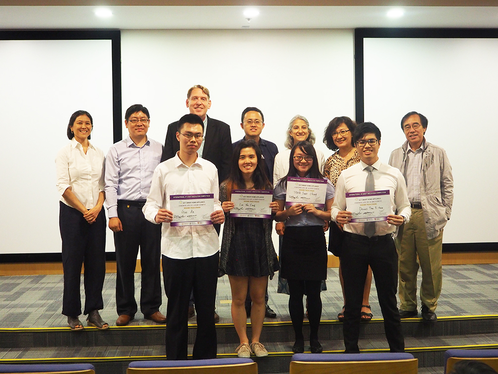 The winning team The Elderly (Guo An from ShanghaiTech, Tang Suet Chung from HKUST, Lim Shu Fang and Dennis Tan Yi Xuan from NTU) created an IOT device that aims to deliver a communication experience by virtually linking their homes together through video capturing and 1-to-1 scale projection on home walls simulating face-to–face communications in the same virtual space. The Elderly has the vision of creating a friendly space for elderly to adopt technology and a platform with scalability for further development in Smart Home for elderly.