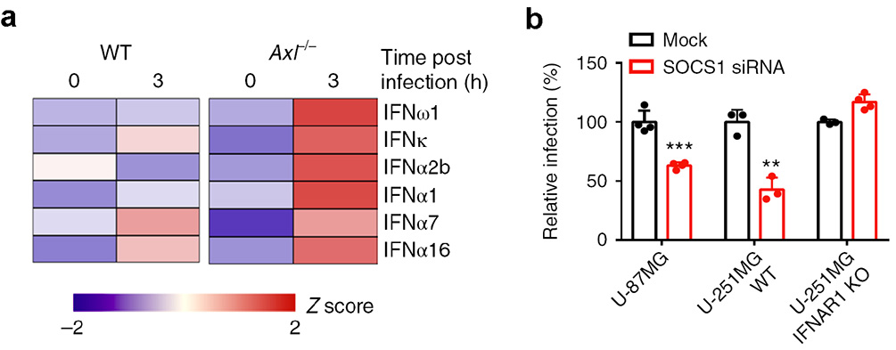 Note:a. AXL antagonizes type I IFN signaling during ZIKV infection. b. SOCS1 played a critical role in AXL-mediated regulation of type I IFN signaling.