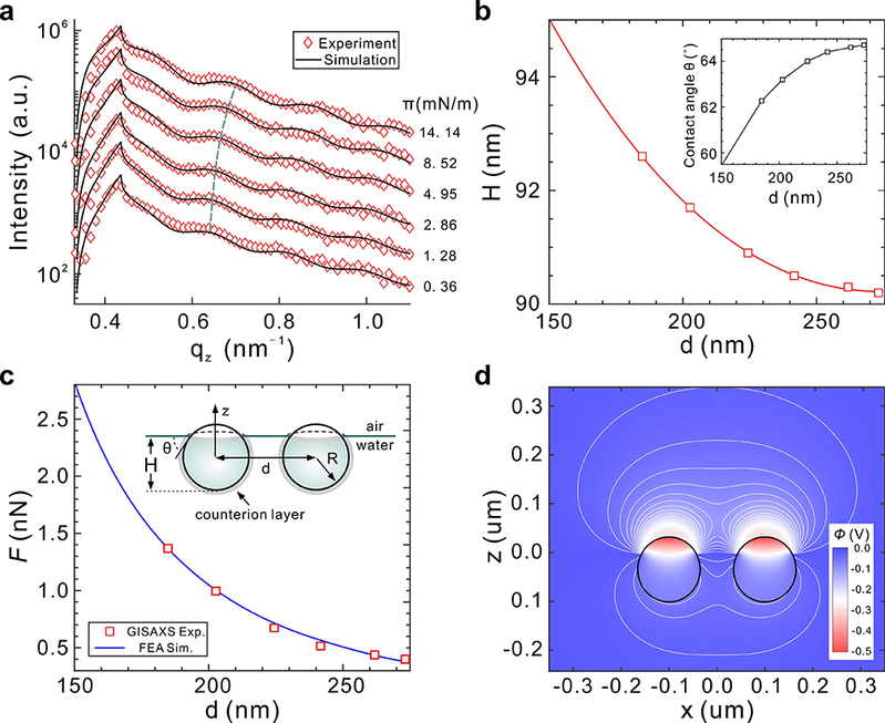 In this work, Professor Chen and his team report the in situ grazing-incidence small-angle X-ray scattering (GISAXS) study of the real-time self-assembly process of polystyrene nanospheres on the air/water interface of a Langmuir-Blodgett (LB) trough. This approach allows for simultaneous monitoring of the in-plane ordering and crystallization and the out-of-plane immersion depth (or contact angle) variation, providing a complete picture of the interfacial colloidal self-assembly process. Upon compression, multiple metastable intermediate states are observed before the stable 2D hexagonal close-packed superlattice monolayer forms under van der Waals attraction. Surprisingly, the immersion depth of the colloidal particles is found to vary with the interparticle distance. Numerical simulations demonstrate that the out-of-plane component of the electrostatic force from neighboring particles increases as the interparticle distance decreases. Such a force presses the particle into water, which deforms the interface and induces the long-ranged capillary attraction. This new finding provides an important clue to the long-standing mystery of the attractive interaction between like-charged particles.