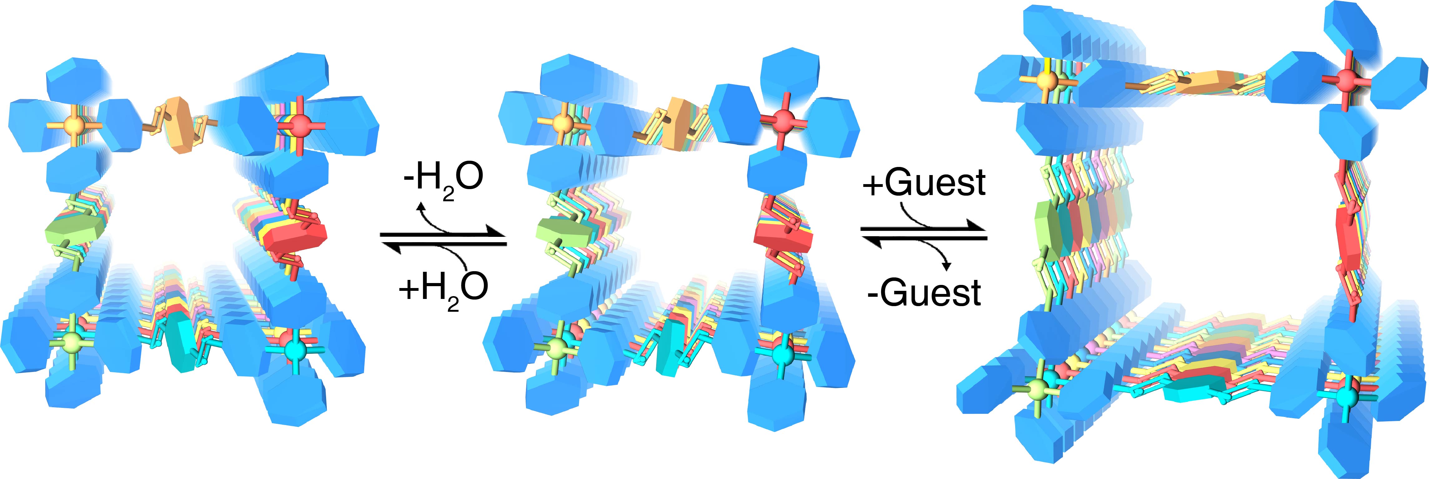 However, the researchers did not observe the nitrogen adsorption behavior at 77 K when they began the further property study, which took research team wondering. Thanks to the convenience of Analytical Instrumentation Center in School of Physical Science and Technology, the team characterized the water and various organic vapor adsorption and gas adsorption behavior in different temperatures. They found the dynamic structure and multi-step behavior in such crystals. With the help of synchrotron X-ray diffraction in Shanghai Synchrotron Radiation Facility and Rietveld refinement, researchers determined three different frameworks structures in different chemical environments. They found that the organic solvents and water can induce the crystal expansion and contraction of COF-300 respectively. This work illustrated the structural adaptability and guest dependence of COFs. This solvent-induced dynamic behavior is similar to the response mechanism of substrates and solvents in biological enzymes catalytic process. It provides new ideas in the design of biomimetic materials. In addition, Zhang’s group used gas adsorption in suit powder X-ray diffraction for the first time to prove that framework structure undergone dynamic crystal structure transformation during gas adsorption. It provides a new thinking in application in gas storage and separation.