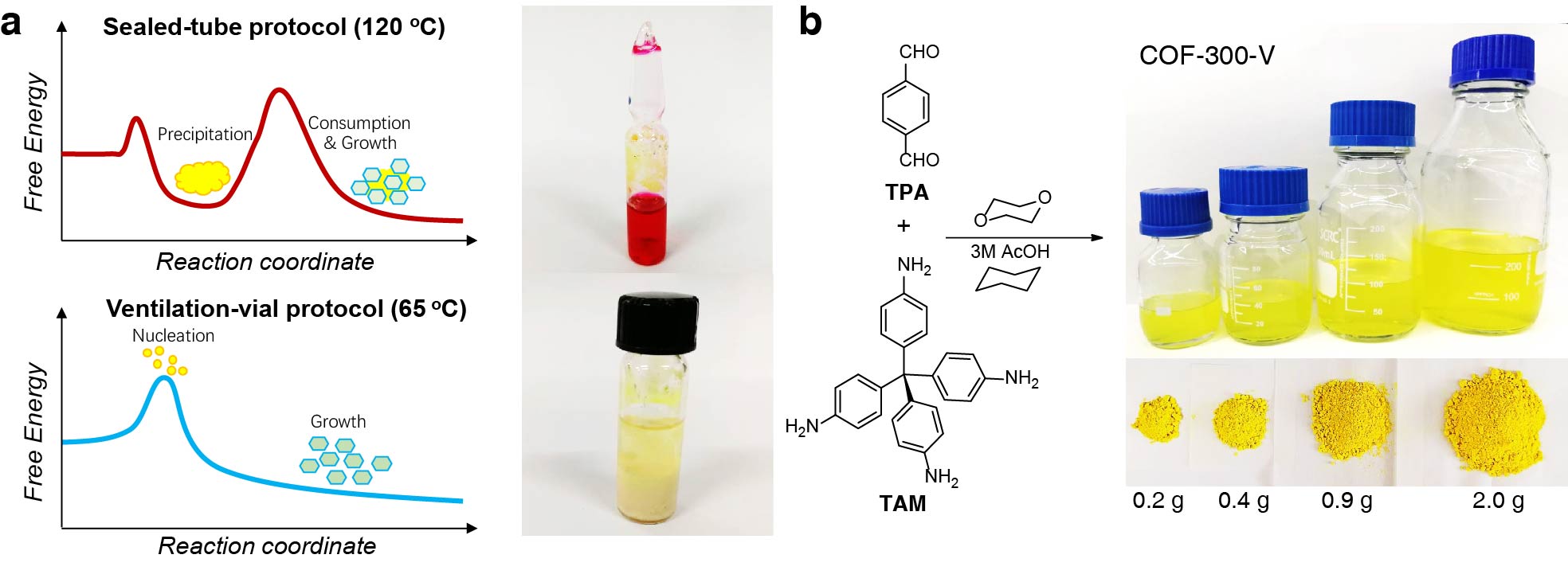 Figure 1. (a) the mechanism of COF crystallization for two methods. (b) Facial and scalable synthesis of COF-300.