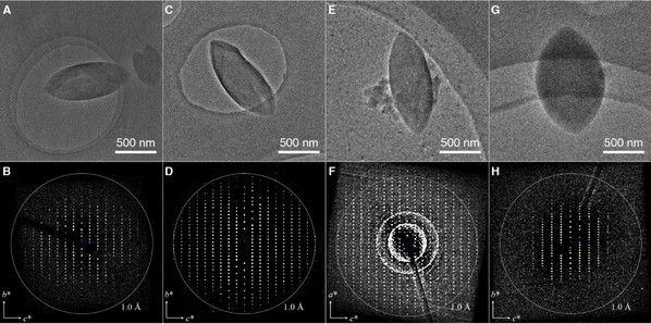 Figure 2. Atomic-level characterization of dynamics through electron diffraction tomography illustrated by COF-300 with single crystals at only micrometer size. The TEM images of the single crystals and the EDT data projected along the [100] or [010] direction for the activated phase COF-300-V with routine holder (a, b). With cryo-holder the resolution of electron diffraction data has been significantly improved (c, d). The TEM images of the single crystal for hydrated phase shows a small amount of vitrified ice around the crystal and electron diffraction images show ice diffraction rings (e, f). The aspect ratio of the crystal for COF-300-PMMA phase is significantly smaller than that of the other two phases (g and h).