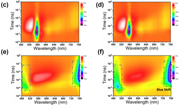 Figure 2. (c, d) TAS of BAB-based DJ structure perovskite film before and after continuous operation. (e, f) TAS of PEA-based RP structure perovskite film before and after continuous operation, the intensity of the bleaching peak at 485 nm is increased, the peak at 770 nm is slightly blue shifted.