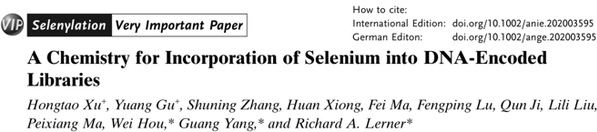 Recently, Angewandte Chemie International Edition published a collaborative study led by Professors Richard A. Lerner and Yang Guang from Shanghai Institute for Advanced Immunochemical Studies (SIAIS) of ShanghaiTech University, entitled “A Chemistry for Incorporation of Selenium into DNA-Encoded Libraries”. This paper has been highlighted as Very Important Paper (Top 5%) and selected as Cover Feature.