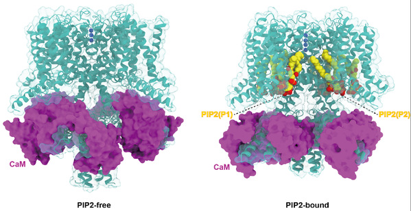 It is known that the channel opening of all KCNQs relies on the signaling lipid molecule PIP2. However, the molecular mechanism of PIP2 in modulating the opening of the four neuronal KCNQ channels (KCNQ2-5), which are essential for regulating neuronal excitability, remains largely elusive. Researchers purified the human KCNQ4 protein and assembled it with PIP2-containing nanodisc to present the target protein in a near-to-native membrane environment. Structural analysis and comparison with the closed-state structure in the absence of PIP2 (also reported in this study) revealed an open conformation of the channel. This is the first report of the open-state structure of a neuronal KCNQ channel thus providing new insight into the field. It is worth mentioning that the structure provides the first-hand validation of this hypothesis, despite a number of biochemical and computational studies in the past that have predicted two potential PIP2 binding sites. Comparing it with the structure of KCNQ4 in the absence of PIP2, the researchers found that binding of PIP2 results in large-scale structural rearrangements occurring in the cytosolic domain and CaM. Moreover, the two PIP2 molecules modulate in a synergistic way in the electromechanical coupling of voltage-sensing domain (VSD) and pore domain (PD) to open the channel. Sequence alignment with other KCNQ channels showed that the two PIP2 binding sites are absolutely conserved, implying a similar modulating mechanism for other KCNQ channels. This study elucidated the molecular mechanism of PIP2 regulating the opening of the KCNQ family of channels, provided new opportunity for drug discovery targeting KCNQ channels, and laid a scientific foundation for the clinical transformation of deafness and other neurological diseases.