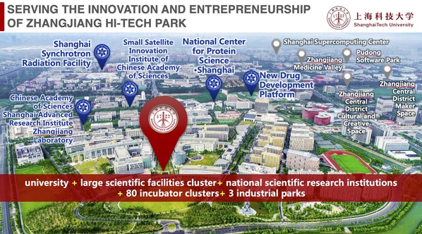 Located in the heart of Shanghai Pudong’s Zhangjiang Hi-Tech Park, ShanghaiTech is a key part of the Zhangjiang Comprehensive National Science Center and forms a research cluster with nearby national scientific facilities and research institutions, such as Shanghai Synchrotron Radiation Facility (SSRF), National Center for Protein Science (Shanghai), Shanghai Advanced Research Institute (CAS), Innovation Academy for Microsatellites (CAS), and Drug Discovery & Development Platform of Shanghai Institute of Materia Medica (CAS), naturally fostering ShanghaiTech’s connection with industry and investment partners in Zhangjiang.