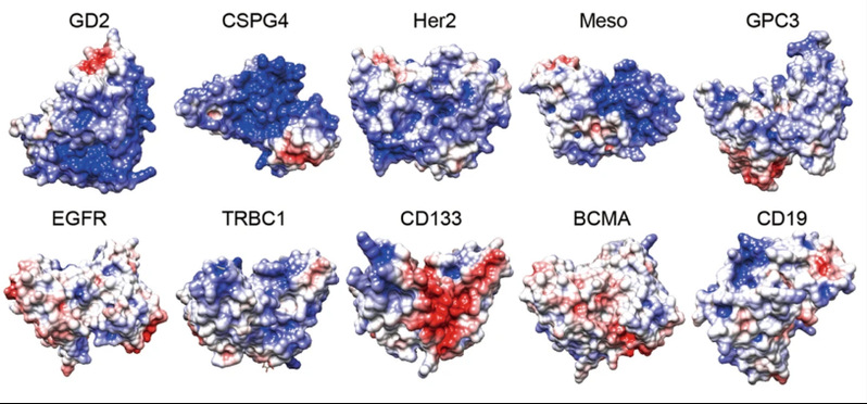 Figure 1. Surface charge distribution of CAR receptors (Electrostatics analysis of the ten CAR scFv constructions. Blue, positively charged surface; red, negatively charged surface).