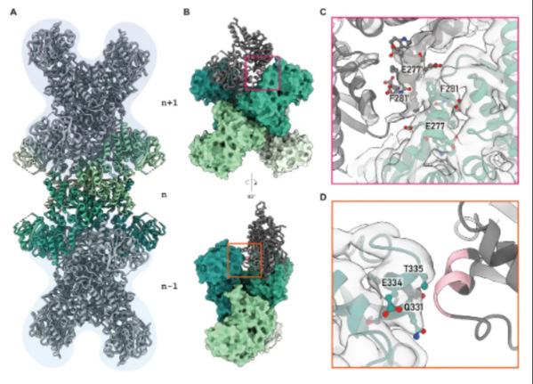 CTP synthase (CTPS) is critical in CTP biosesynthesis, and is a fundamental precursor for RNA and DNA synthesis. The enzyme interacts directly with all four ribonucleoside triphosphates (ATP, UTP, CTP, and GTP) and participates in the formation of cytoophidia and metabolic fibers which are regulated at various levels within the cell. Utilizing cryo-electron microscopy, the research team resolved the structure of Escherichia coli CTP synthase (ecCTPS) in complex with CTP, reduced nicotinamide adenine dinucleotide (NADH), and a covalent inhibitor, 6-Diazo-5-oxo-L-norleucine (DON), achieving a resolution of 2.9 Å. By constructing a phylogenetic tree based on the differences in metabolic fiber formation, the team discovered the significance of helix 12 in CTPS metabolic fiber formation and created a variant to validate their hypothesis. This underscored the critical role of helix 12 in CTPS metabolic filamentation, offering an evolutionary perspective on the phenomenon. Binding with DON created an accessible ammonia tunnel within ecCTPS and highlighted notable differences in CTP binding modes between prokaryotic and eukaryotic CTPS. Through biochemical and structural analyses, researchers identified a synergistic inhibitory effect of CTP and adenine on ecCTPS with NADH.