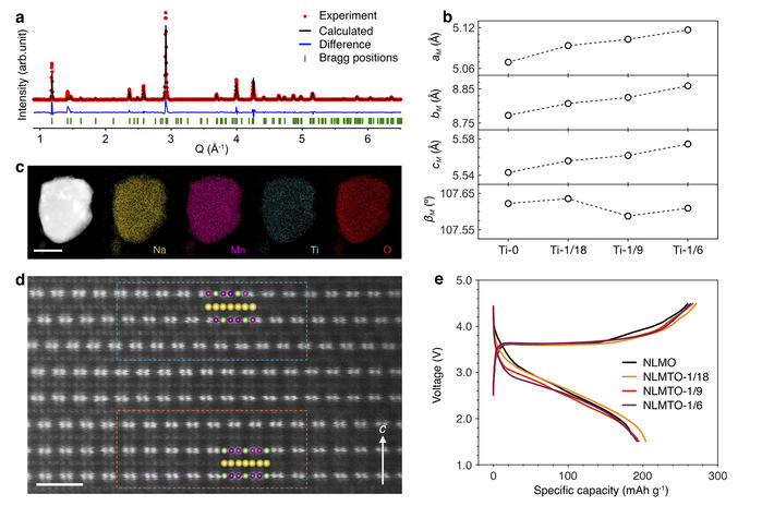 Figure 2: Structure and electrochemical performance of titanium-doped NaLi1/3Mn2/3-xTixO₂.