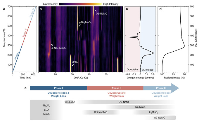 Xu’s team pinpointed the crux of the issue: the “atmosphere”—specifically, the oxygen concentration during synthesis. Past efforts using pure oxygen or inert gases like argon consistently failed. Through experiments with O3-Na[Li1/3Mn2/3]O2—a compound of sodium, lithium, and manganese—they employed cutting-edge real-time monitoring techniques, including X-ray diffraction, thermogravimetry analysis, and gas chromatography, to track changes in both the solid material and surrounding gases (see Figure 1).