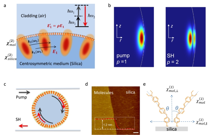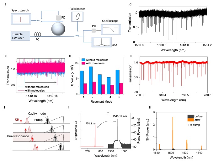 The research team addressed this challenge by applying a monolayer of specially designed molecules—just 1.2 nanometers thick, roughly 1/100,000th the width of a human hair, to the surface of a silica microcavity, a sphere-shaped structure that traps and amplifies light. These molecules, arranged asymmetrically, unlocked the device’s ability to convert infrared laser light into visible light through a process called second harmonic generation (SHG). Under low-power laser light (similar to telecom systems), the coated device produced visible light with 100 times greater efficiencycompared to uncoated versions. Supported by theoretical modeling, the team discovered the enhancement, which stems from interactions between the laser’s evanescent field (light that extends beyond the microcavity’s surface) and the molecular layer.