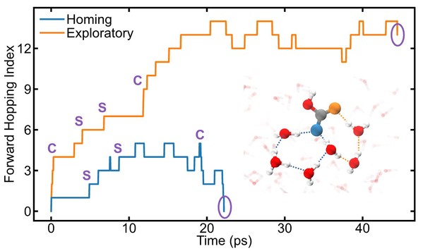 Protons from CT dissociation exhibit an 82.95% preference for the “returning path,” compared to only 57.76% for CC. This stems from a greater difference in proton competition ability between the deprotonated oxygen and the original carbonyl oxygen in CT-derived HCO3−.