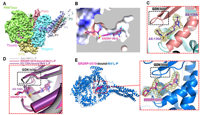 (E) Molecular details of ERDRP-0519 binding to the Nipah virus L-P complex.