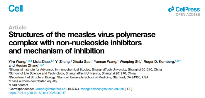 On July 7, a research team led by Research Associate Professor Zhang Heqiao and Distinguished Adjunct Professor Roger Kornberg (Lab of Structural Biochemistry) at Shanghai Institute for Advanced Immunochemical Studies (SIAIS), ShanghaiTech University, published a research article in Cell. The study, titled Structures of the measles virus polymerase complex with non-nucleoside inhibitors and mechanism of inhibition,” elucidates the molecular mechanism by which non-nucleoside inhibitors suppress the RNA polymerase complexes of measles virus (MeV) and Nipah virus (NiV).