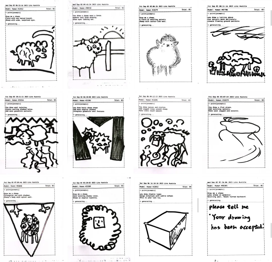 txt2img⁻¹ is an interactive installation centered on the reversal of human-machine relationships, themed as a “human-machine shepherding” device. The work simulates the power transposition between “shepherd and sheep,” positioning the audience from creator to executor, continuously sketching the AI’s imagined “sheep” according to its instructions. That is, the audience becomes “machine” and the machine becomes “audience.” In the iterative process of “submission—feedback—revision,” human creation is transformed into adherence to algorithmic will, until receiving “acceptance” or facing “rejection.” The installation uses gamification as an invitation, guiding viewers behind its easy interaction to confront a key question: in an era where AI deeply intervenes in creation, thinking, and decision-making, how is human subjectivity reshaped, weakened, or redefined?