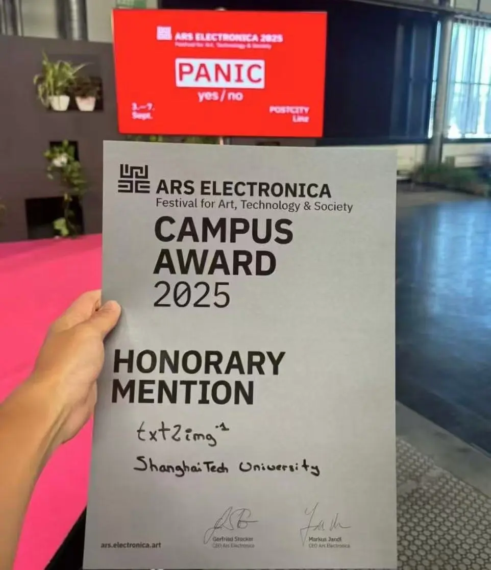 A team comprising students from the School of Creativity and Art (SCA), the School of Information Science and Technology (SIST), and the School of Life Science and Technology (SLST) at ShanghaiTech University, showcased five techno-art works at the Ars Electronica Festival 2025, held from September 3 to 7 in Linz, Austria. One of their works, “txt2img⁻¹”, stood out with its unique perspective and interactive presentation on human-machine relationships, emerging from numerous works from globally renowned universities, and winning the 2025 ARS ELECTRONICA CAMPUS AWARD.
